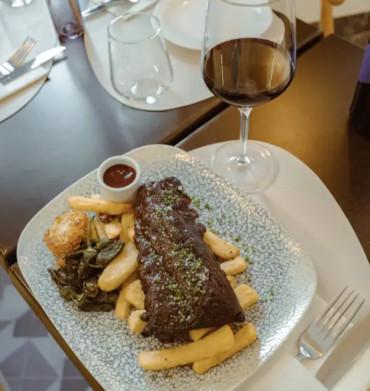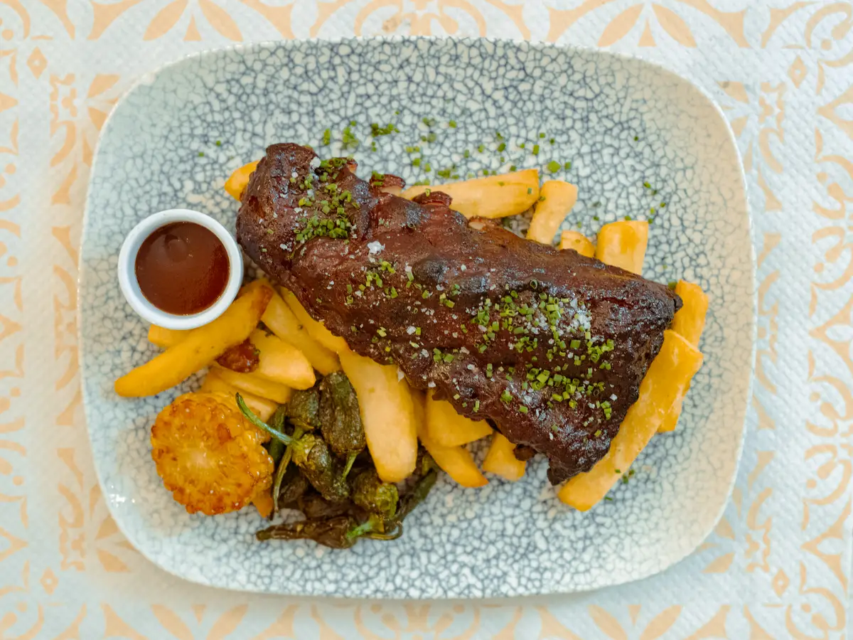 Costilla de cerdo a baja temperatura con salsa bbq, patatas fritas y pimientos del padrón.
