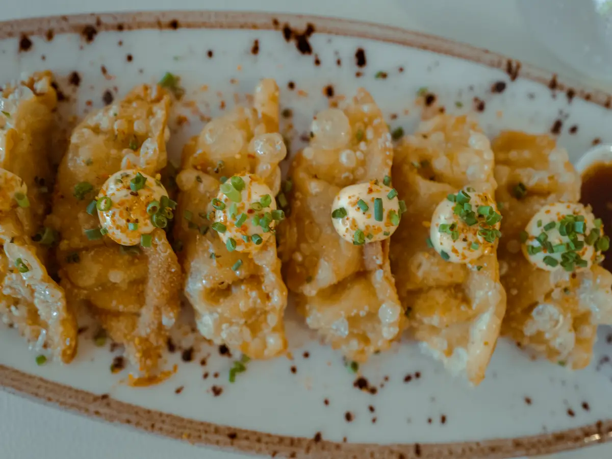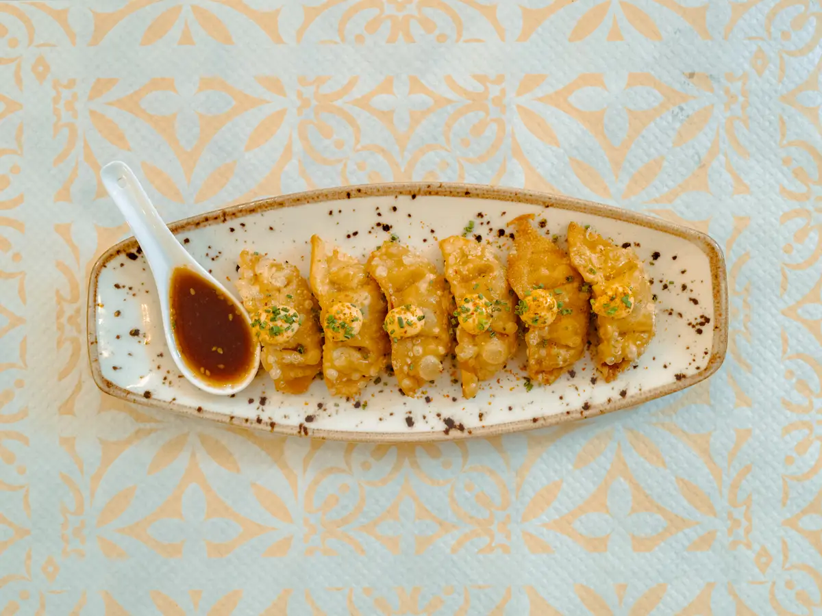 Gyozas de pato o verduras crujientes con salsa yakiniku y nanami togarashi.