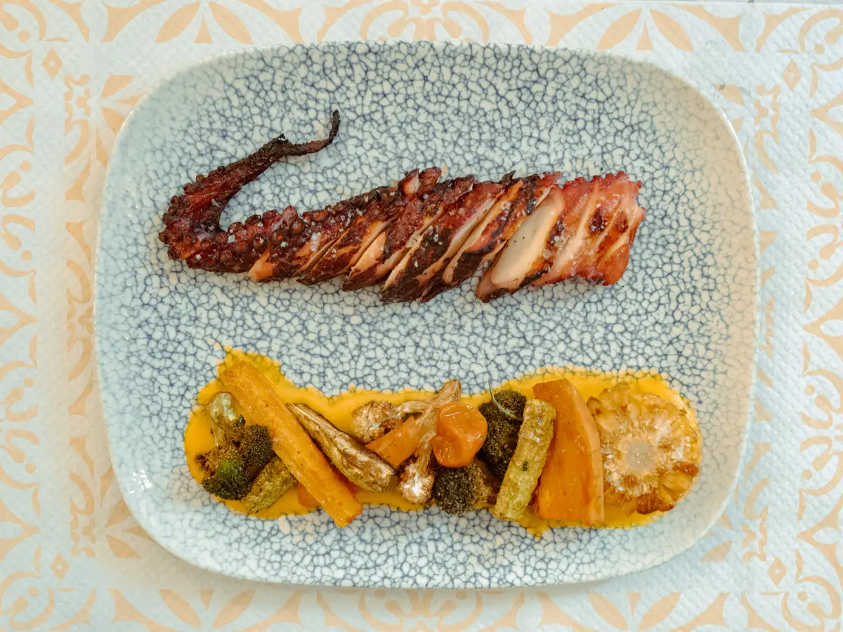 Pulpo a la brasa con puré de zanahoria y verduras frescas de temporada.
