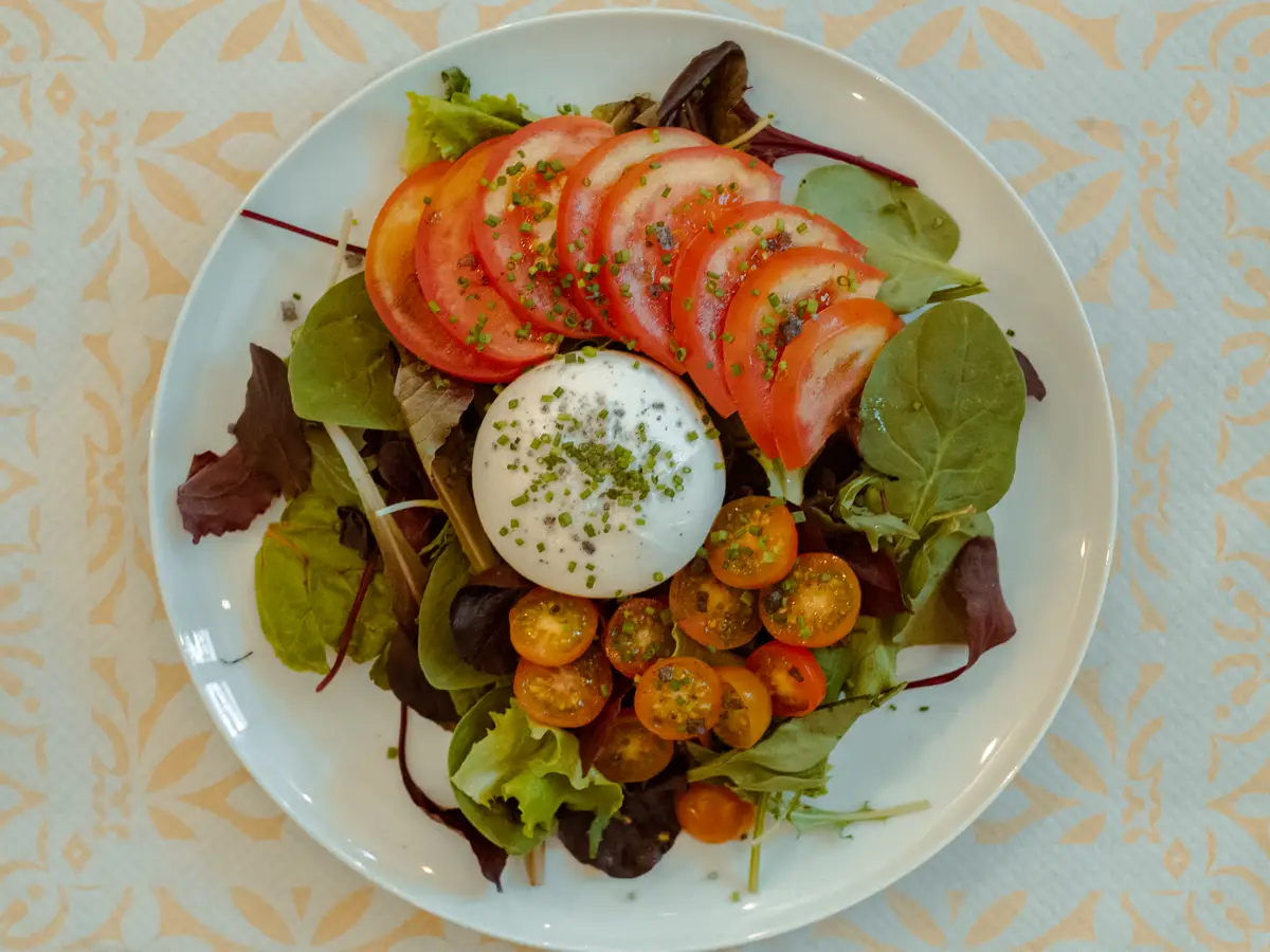 Ensalada de burrata con diferentes tipos de tomates de campo y aove de la tierra.